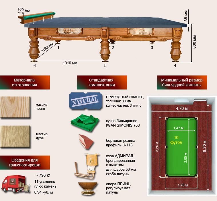 - Размер — бильярдные столы с длиной 8 футов, 9 футов, 10 футов, 12 футов. В младшей серии есть даже длина 6 футов;